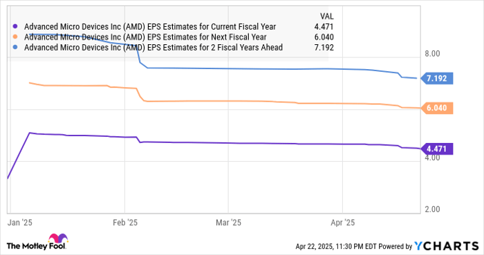 Consensus estimates are projecting a 36% increase in AMD’s earnings to $4.51 per share this year. That’s expected to be followed by healthy growth over the next couple of years as well, despite recent downward revisions in those estimates due to the economic headwinds created by President Donald Trump’s tariffs and trade wars.