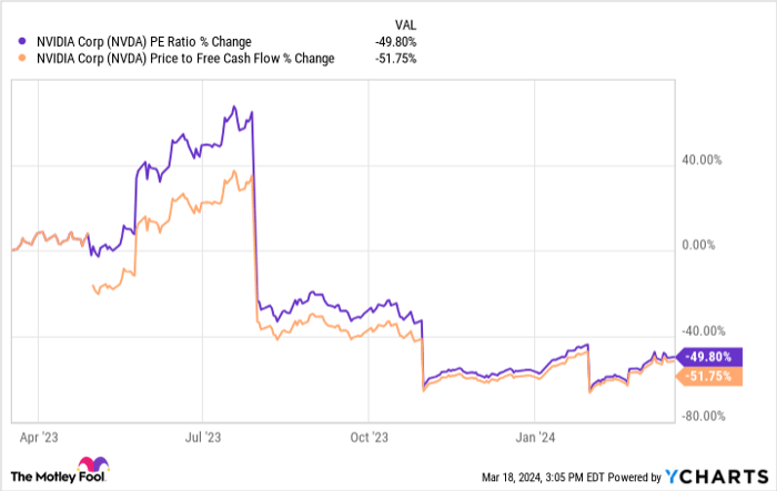Comparing Nvidia’s price-to-free-cash-flow and price-to-earnings ratios over the recent year reveals a decline, signaling that the stock stands at its most appealing valuation in 12 months.