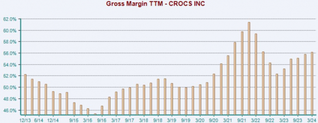 The company exceeded the Zacks Consensus EPS estimate by a whopping 34%. Noteworthy margin expansion has further contributed to Crocs’ profitability, with a Q4 gross margin of 55.3%, up from 52.5% in the corresponding period last year.