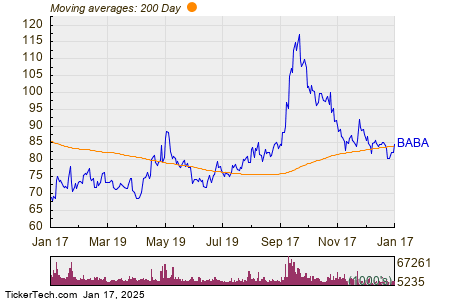 In trading on Friday, shares of Alibaba Group Holding Ltd (Symbol: BABA) crossed above their 200 day moving average of $84.36, changing hands as high as $85.59 per share. Alibaba Group Holding Ltd shares are currently trading up about 3.3% on the day. The chart below shows the one year performance of BABA shares, versus its 200 day moving average: