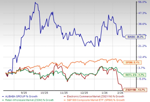 Alibaba BABA shares have surged 28% in the past six-month period, outperforming the Zacks Internet – Commerce industry and the Zacks Retail-Wholesale sector. While the rally has rewarded shareholders, a closer look at Alibaba’s fundamentals, competitive pressures and deteriorating profitability suggests that 2026 may not be the year to stay invested in BABA.