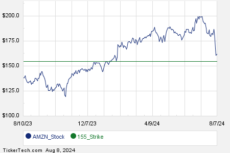 On the calls front, the $170.00 strike emerges with a bid of $5.25. A strategic move entails buying AMZN shares at $164.69 and selling-to-open the call contract, committing to sell shares at $170.00. A covered call transaction seeds a total return of 6.41% if stock call-away plays out at the September 27th culmination, excluding dividends.