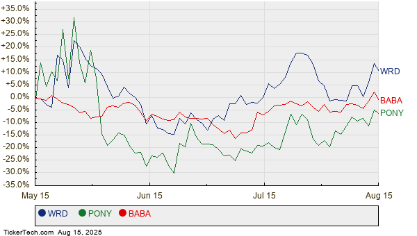 With AIQ trading at a recent price near $45.23 per unit, that means that analysts see 10.30% upside for this ETF looking through to the average analyst targets of the underlying holdings. Three of AIQ’s underlying holdings with notable upside to their analyst target prices are WeRide Inc (Symbol: WRD), PONY AI INC (Symbol: PONY), and Alibaba Group Holding Ltd (Symbol: BABA). Although WRD has traded at a recent price of $9.65/share, the average analyst target is 68.39% higher at $16.25/share. Similarly, PONY has 43.56% upside from the recent share price of $15.15 if the average analyst target price of $21.75/share is reached, and analysts on average are expecting BABA to reach a target price of $157.91/share, which is 29.14% above the recent price of $122.28. Below is a twelve month price history chart comparing the stock performance of WRD, PONY, and BABA: