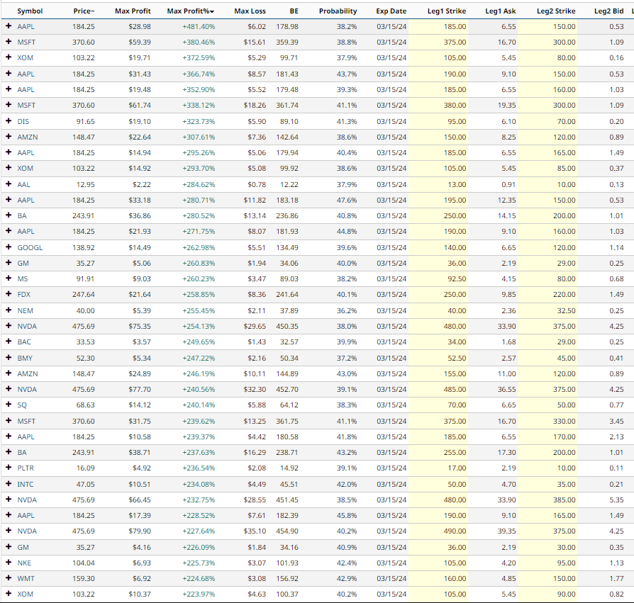 The screener has flagged some intriguing trades featuring impressive Max Profit Percentages. Let’s delve into the first item in the table – a bear put spread concerning Apple (AAPL).
