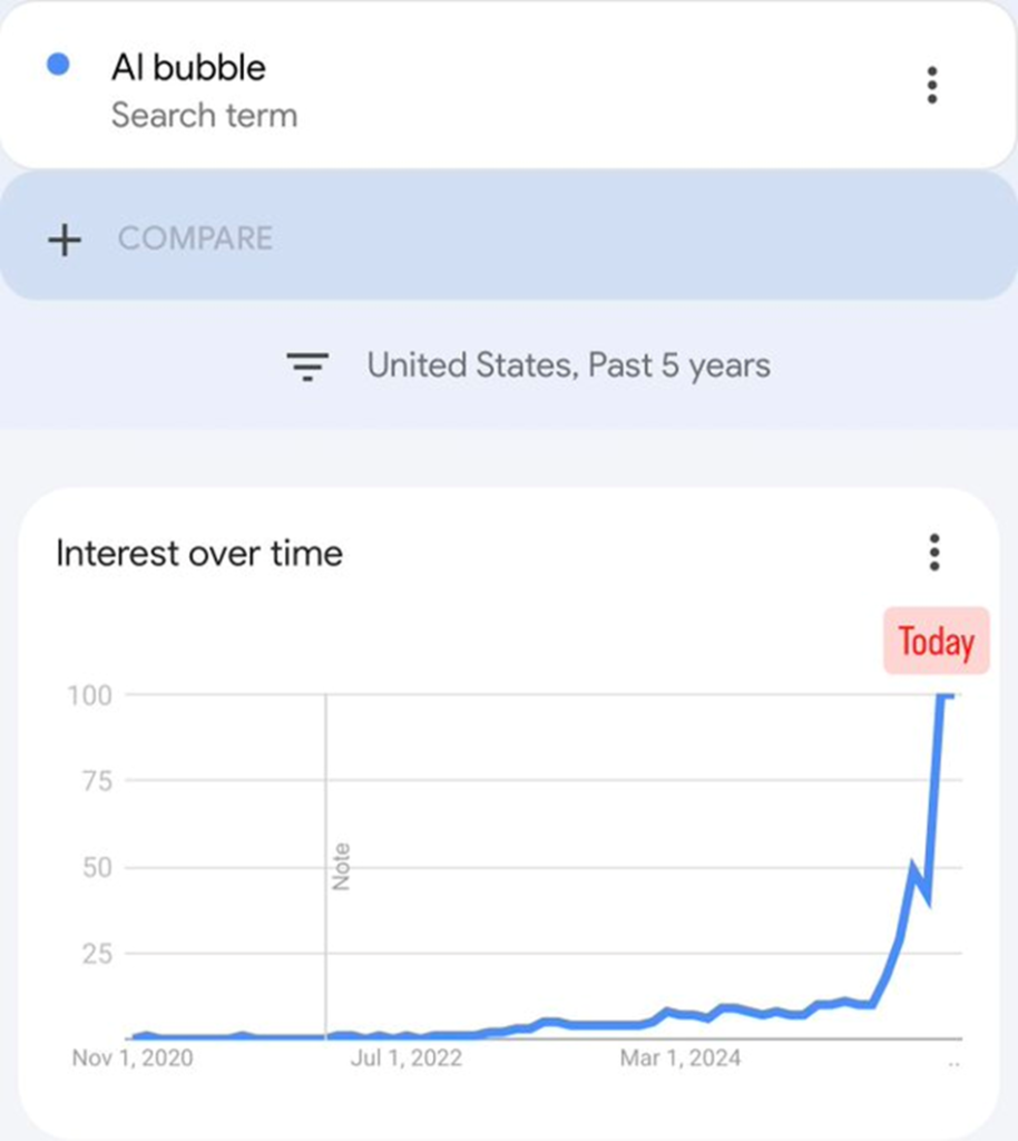 Kalshi reported that searches for “AI bubble” have just hit an all-time high – a spike you’ll see in the chart below.