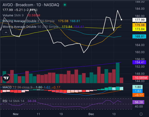 Broadcom stock is technically bullish, supported by multiple bullish signals across key moving averages: the eight-day SMA at $175.08, the 20-day SMA at $168.81, the 50-day SMA at $173.84 and the 200-day SMA at $154.41.