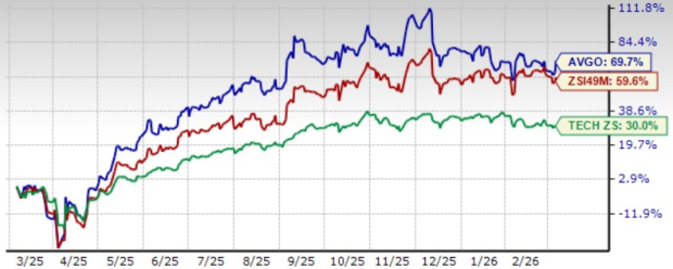 AVGO shares have jumped 69.7% in the trailing 12 months, outperforming the broader Zacks Computer and Technology sector’s and the Zacks Electronics – Semiconductors industry’s returns of 25.2% and 53.2%, respectively. The outperformance can be attributed to an innovative product portfolio, growing clientele and an expanding partner base. AVGO’s prospect benefits from rising AI revenues despite growing concerns over overspending on AI-related infrastructure and services by hyperscalers.