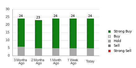 ASML currently has an average brokerage recommendation (ABR) of 1.42, on a scale of 1 to 5 (Strong Buy to Strong Sell), calculated based on the actual recommendations (Buy, Hold, Sell, etc.) made by 24 brokerage firms. An ABR of 1.42 approximates between Strong Buy and Buy.