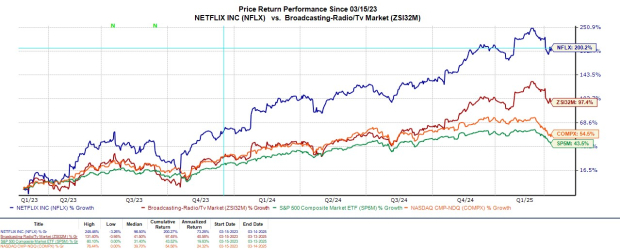 Correlating with a positive trend of earnings estimate revisions, Netflix stock sports a Zacks Rank #1 (Strong Buy). Although tariff concerns have led to recessionary fears, Netflix’s cheaper ad-service could still propel the company in the event of a potential economic downturn. This should also help sustain Netflix as the streaming king ahead of Disney, Paramount, and Amazon.