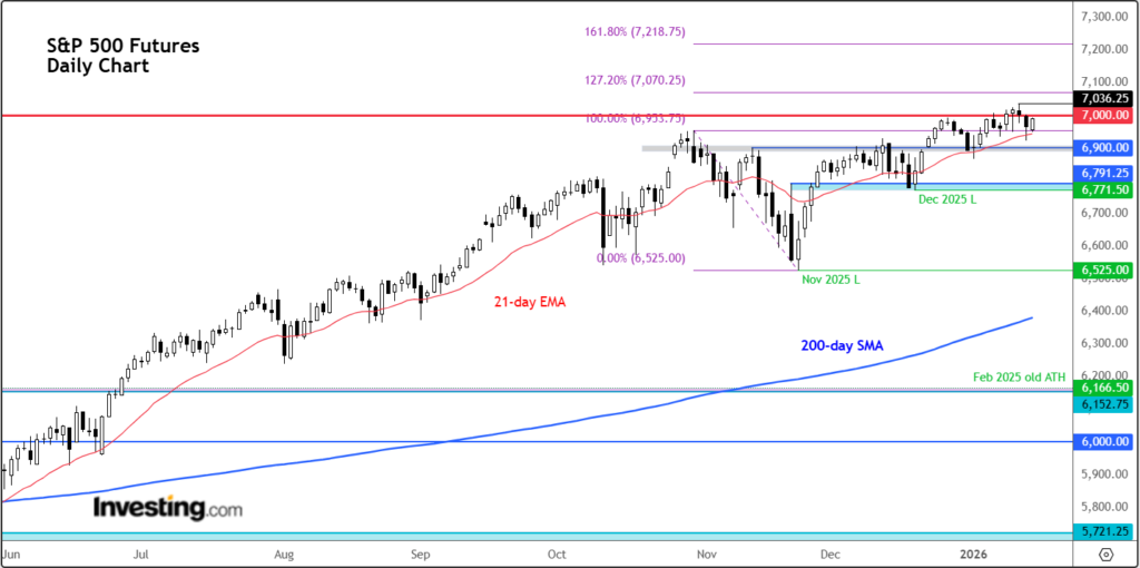 On the upside, 7,000 remains the key hurdle. The market will need to clear this level convincingly to unlock a move to fresh highs. Beyond that, there’s little in the way of obvious resistance, suggesting the technical path higher would be relatively open. Keep an eye on the Fibonacci extension levels shown on the chart as the next potential targets in the event of a continuation.