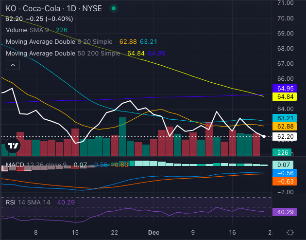 KO stock, at $62.20, is trading below key moving averages, signaling further bearish momentum: