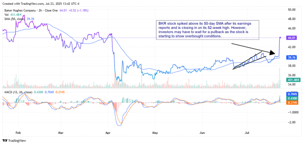 From mid-June to mid-July, BKR stock formed an ascending triangle pattern. A breakout above resistance on strong earnings and volume confirms this bullish formation. With the sharp run-up after earnings, BKR stock has pushed well above its 50-day simple moving average. A bullish reversal in the MACD also supports the sharp move higher.