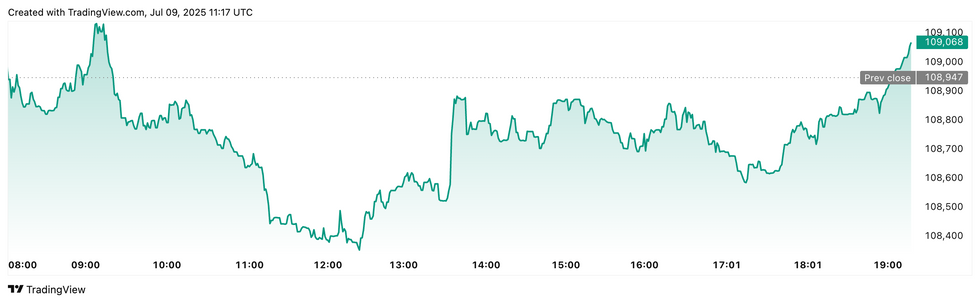 Bitcoin pushed past US$109,000 again buoyed by mild support from institutional inflows and risk-on sentiment amid tariff uncertainty.