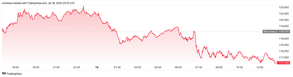 Bitcoin (BTC) was priced at US$117,488, down by 1.3 percent in the last 24 hours. The day’s range for the cryptocurrency brought a low of US$117.409 and a high of US$119,529.