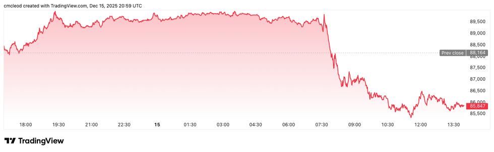 Bitcoin price performance, December 15, 2025.