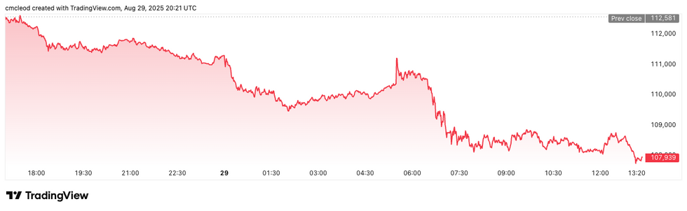 Bitcoin price performance, August 29, 2025.