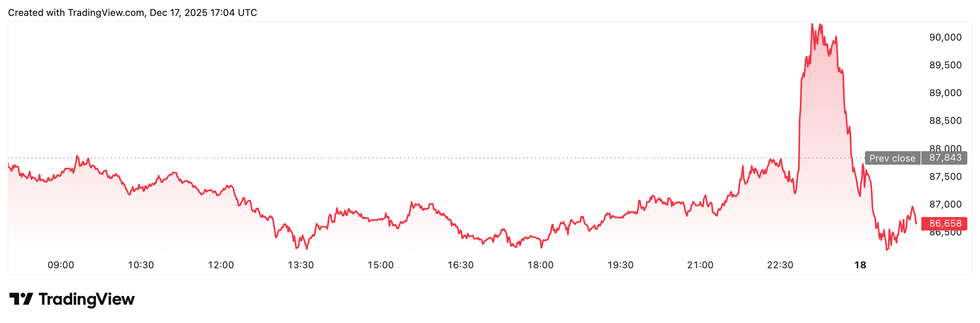 Bitcoin (BTC) was priced at US$86,981, down by 1 percent over 24 hours.