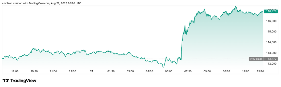 Bitcoin (BTC) was priced at US$116,546, a 3.9 percent increase in 24 hours. Its lowest valuation of the day was US$112,019 and its highest was US$117,310.