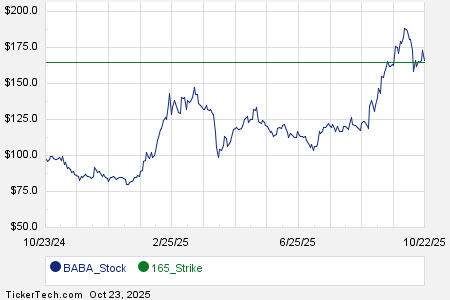 Below is a chart showing the trailing twelve month trading history for Alibaba Group Holding Ltd, and highlighting in green where the $165.00 strike is located relative to that history: