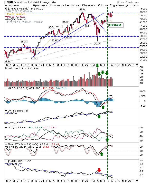 The remains the laggard on the weekly timeframe. However, it does now enjoy a net bullish technical picture.