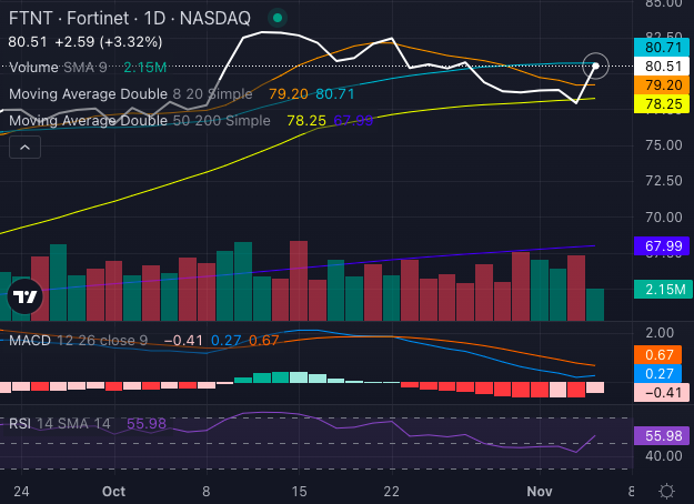 However, with Fortinet stock trading at $80.51, below the 20-day simple moving average (SMA) of $80.71, some short-term bearish momentum prevails.