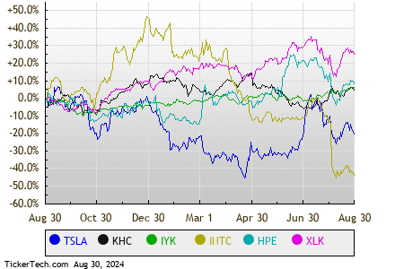 As the closing bell approaches this Friday, the sector leaders are making waves in the market. Consumer Products companies are currently riding the crest, with a 0.2% lead over other sectors. Among the giants in this sector, Tesla Inc (TSLA) and Kraft Heinz Co (KHC) are setting the pace, boasting gains of 2.4% and 1.4%, respectively. The iShares U.S. Consumer Goods ETF (IYK) is closely tracking these movements, showing a 0.2% increase for the day and an impressive 11.20% climb year-to-date. However, Tesla Inc and Kraft Heinz Co have seen their year-to-date performances take different paths. Tesla Inc is down by 15.03%, while Kraft Heinz Co is trailing with a 2.29% decrease. Notably, KHC comprises about 1.4% of the underlying holdings of IYK.