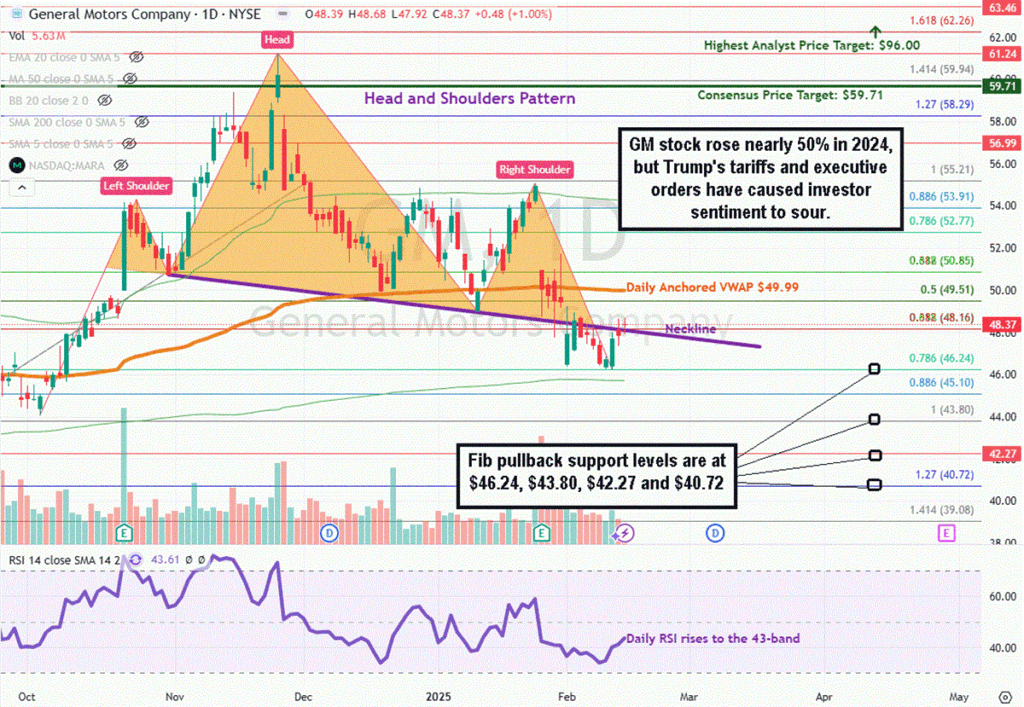 GM formed a bearish head and shoulders pattern, with its head peaking at $61.24. The right shoulder peaked at $55.21. GM fell below its daily anchored VWAP support at $49.99 to the $46.24 fib after the Q4 earnings release. GM is attempting to rally back above the neckline at $48.37 to prevent the breakdown from following through.