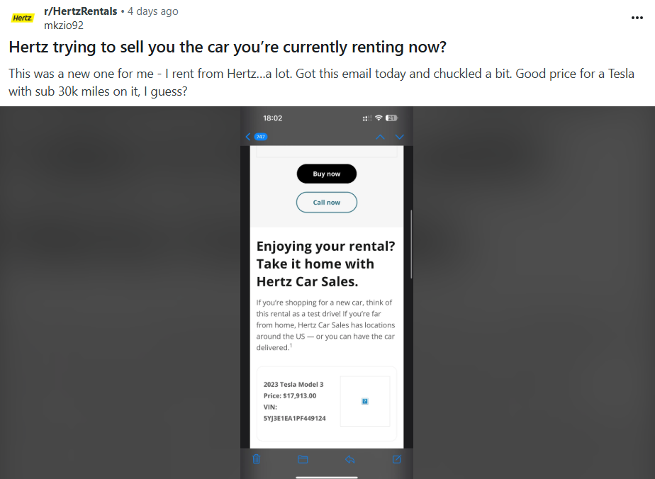 Hertz is also reportedly sending cheap buyout options to rental customers, as flagged by a Reddit user. The screenshot shared by the user shows Hertz pitching the model year 2023 Model 3 to the renter for $17,913. The vehicle had reportedly traveled less than 30,000 miles, making the offer a steal deal. A brand new Model 3 in the U.S. starts at $42,490 without offers.