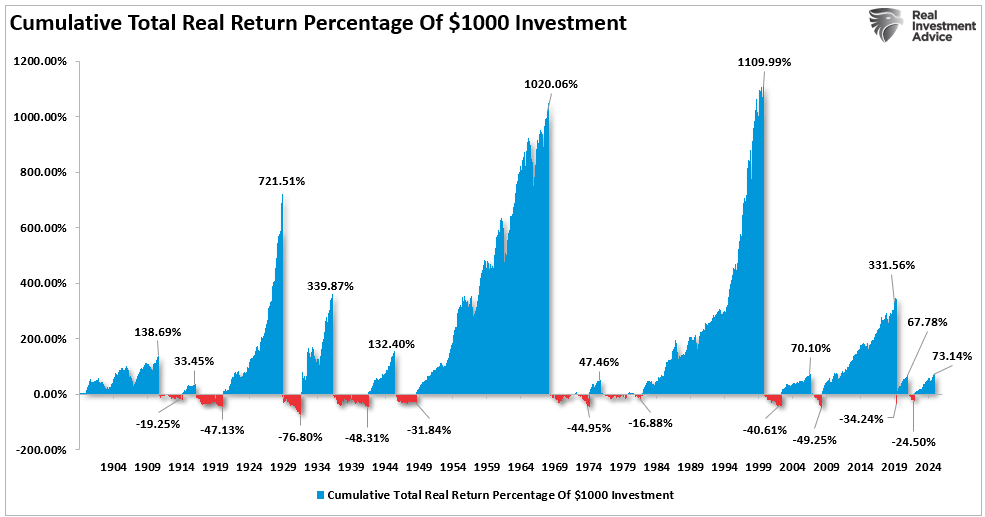 This certainly seems to be true when looking at a chart of “percentage returns. “ The chart below uses monthly, inflation-adjusted returns for $1000 invested in the (data via Robert Shiller, Yale University)
