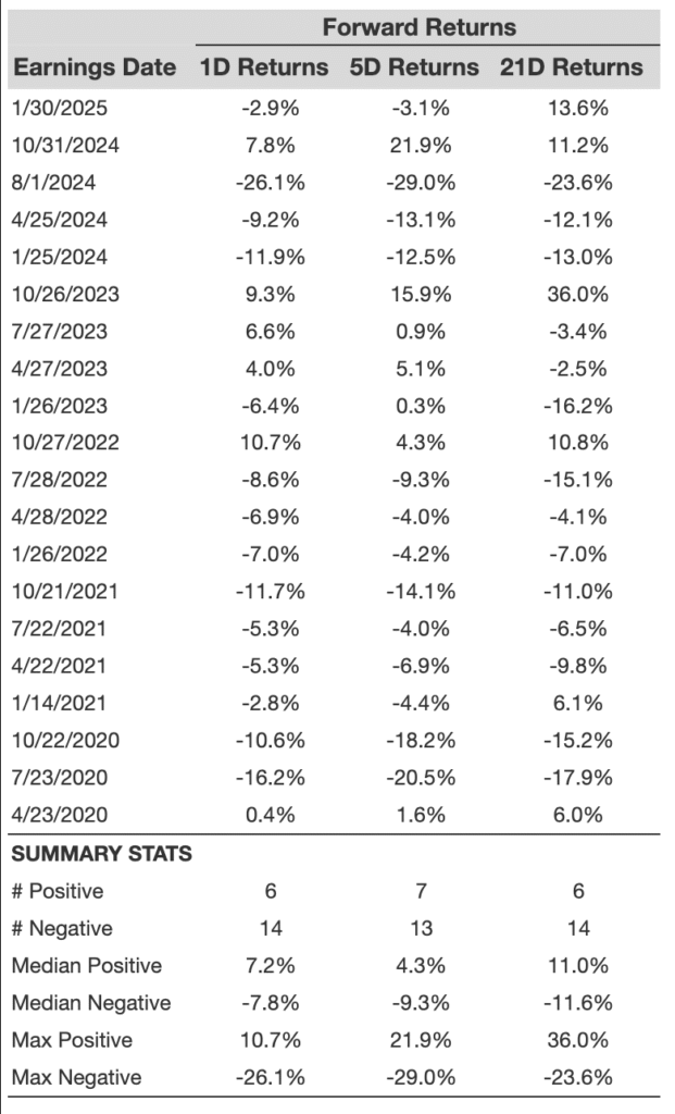 - There are 20 earnings data points recorded over the last five years, with 6 positive and 14 negative one-day (1D) returns observed. In summary, positive 1D returns were seen about 30% of the time.