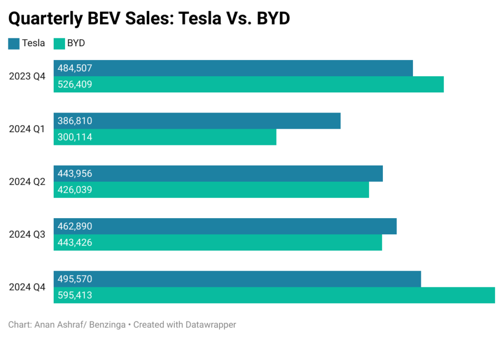 What Happened: BYD first took over Tesla as the world’s biggest BEV seller in the last quarter of 2023. Tesla took back the crown in the first quarter of 2024 and kept it for three consecutive quarters.