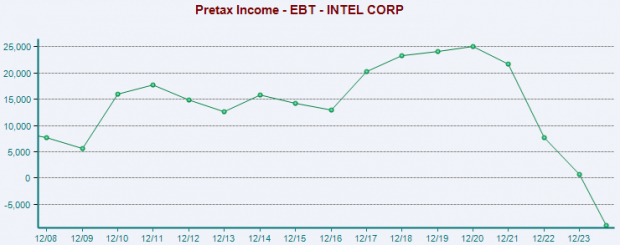 Earnings estimates for Intel for 2024 have moved down 87.8% to 23 cents over the past year, while the same for 2025 has declined 54.2% to $1.03. The negative estimate revision depicts bearish sentiments for the stock.