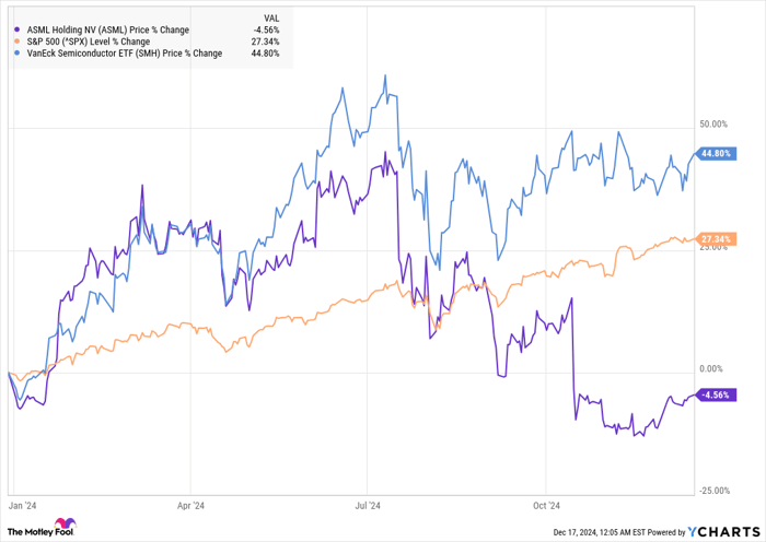 However, that competitive advantage hasn’t helped the stock much this year. While peers like Taiwan Semiconductor Manufacturing have soared this year, ASML has gotten left behind in the artificial intelligence (AI) boom. Year to date through Dec. 16, the stock is down 5%, badly underperforming the S&P 500 and the broader chip sector.