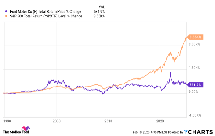 Ford is a cyclical business because it is sensitive to the economy and consumer spending. Long-term investors can sometimes do well buying a cyclical business when times are tough, earnings are lower, and sentiment toward the stock is at its lowest. Unfortunately, Ford stock has badly lagged the S&P 500 through multiple economic cycles.