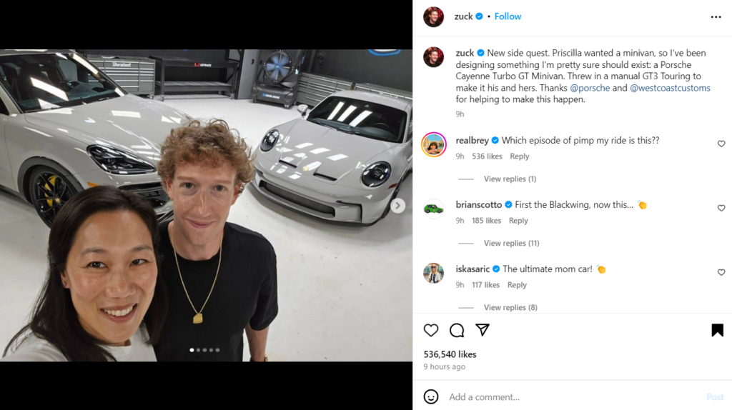 Zuckerberg’s visionary touch didn’t stop there. He also acquired a Porsche 911 GT3 with a Touring package in a similar gray hue to complement the minivan, highlighting the harmony in his choice of vehicles.