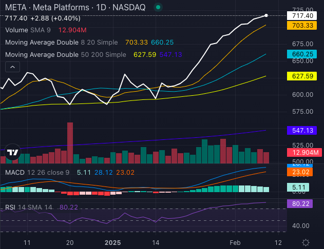 With Meta trading above its eight, 20, 50 and 200-day simple moving averages, the trend is undeniably bullish. Even the MACD (moving average convergence/divergence) indicator at 28.12 and RSI (relative strength index) at 80.22 suggest strong momentum—though an RSI that high could mean it’s getting overheated.