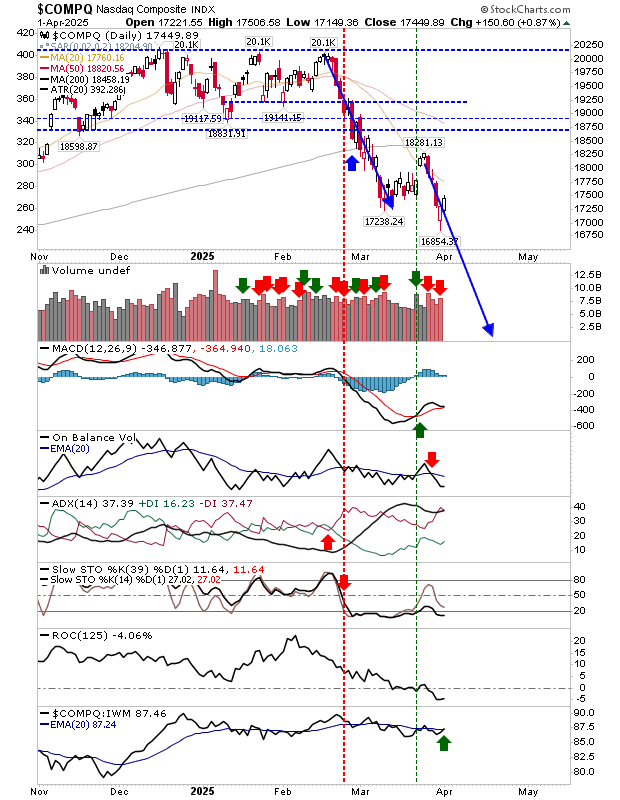 The hadn’t undercut its March low, but it did manage to rally to its 20-day MA. It’s in a more bullish position than the Nasdaq with fresh ’buy’ triggers for On-Balance-Volume and MACD. It still has lots of work to do, but at this stage, it is considered in ’neutral’ territory.