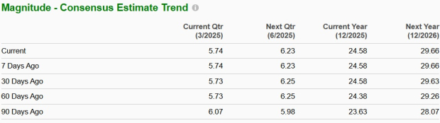 The Zacks Consensus Estimate for NFLX’s 2025 revenues is pegged at $44.47 billion, indicating 14.03% year-over-year growth. The consensus mark for earnings is pegged at $24.58 per share, indicating a 23.95% increase from the previous year.