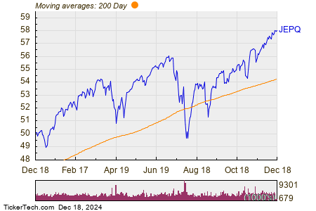 Looking at the chart above, JEPQ’s low point in its 52 week range is $47.6708 per share, with $58.07 as the 52 week high point — that compares with a last trade of $58.04. Comparing the most recent share price to the 200 day moving average can also be a useful technical analysis technique — learn more about the 200 day moving average ».