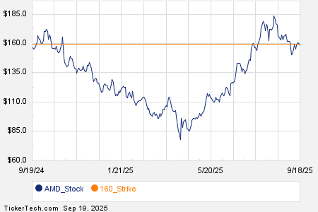Looking at options trading activity among components of the S&P 500 index, there is noteworthy activity today in Advanced Micro Devices Inc (Symbol: AMD), where a total volume of 570,924 contracts has been traded thus far today, a contract volume which is representative of approximately 57.1 million underlying shares (given that every 1 contract represents 100 underlying shares). That number works out to 129.8% of AMD’s average daily trading volume over the past month, of 44.0 million shares. Particularly high volume was seen for the $160 strike call option expiring September 19, 2025, with 97,451 contracts trading so far today, representing approximately 9.7 million underlying shares of AMD. Below is a chart showing AMD’s trailing twelve month trading history, with the $160 strike highlighted in orange: