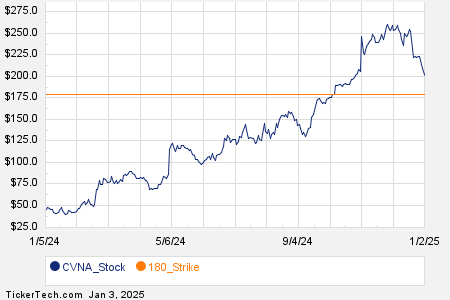 Looking at options trading activity among components of the Russell 3000 index, there is noteworthy activity today in Carvana Co (Symbol: CVNA), where a total volume of 189,331 contracts has been traded thus far today, a contract volume which is representative of approximately 18.9 million underlying shares (given that every 1 contract represents 100 underlying shares). That number works out to 663% of CVNA’s average daily trading volume over the past month, of 2.9 million shares. Especially high volume was seen for the $180 strike put option expiring January 03, 2025, with 12,316 contracts trading so far today, representing approximately 1.2 million underlying shares of CVNA. Below is a chart showing CVNA’s trailing twelve month trading history, with the $180 strike highlighted in orange: