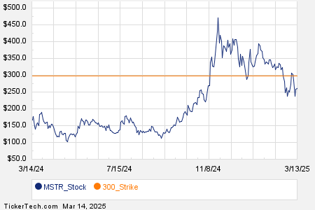 Among the underlying components of the Russell 3000 index, we saw noteworthy options trading volume today in MicroStrategy Inc. (Symbol: MSTR), where a total of 788,071 contracts have traded so far, representing approximately 78.8 million underlying shares. That amounts to about 386.1% of MSTR’s average daily trading volume over the past month of 20.4 million shares. Particularly high volume was seen for the $300 strike call option expiring March 14, 2025, with 38,058 contracts trading so far today, representing approximately 3.8 million underlying shares of MSTR. Below is a chart showing MSTR’s trailing twelve month trading history, with the $300 strike highlighted in orange: