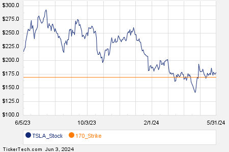 Today’s options trading activity in select S&P 500 index entities stands out as particularly notable. Tesla Inc (TSLA) has seen a surge, with a total volume of 1.0 million contracts traded, equivalent to about 100.5 million underlying shares. It’s a staggering 135.3% of Tesla’s usual average daily trading volume over the past month, painting a picture of intense market interest. The standout of the day? The $170 strike put option expiring June 07, 2024, with a whopping 83,509 contracts exchanged so far. This translates to approximately 8.4 million underlying TSLA shares, creating waves in the stock market sea.