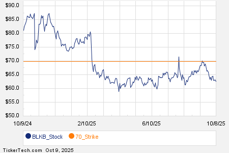 Looking at options trading activity among components of the Russell 3000 index, there is noteworthy activity today in Blackbaud, Inc. (Symbol: BLKB), where a total volume of 19,060 contracts has been traded thus far today, a contract volume which is representative of approximately 1.9 million underlying shares (given that every 1 contract represents 100 underlying shares). That number works out to 531.4% of BLKB’s average daily trading volume over the past month, of 358,670 shares. Especially high volume was seen for the $70 strike call option expiring November 21, 2025, with 5,004 contracts trading so far today, representing approximately 500,400 underlying shares of BLKB. Below is a chart showing BLKB’s trailing twelve month trading history, with the $70 strike highlighted in orange: