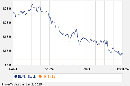 Among the underlying components of the Russell 3000 index, we saw noteworthy options trading volume today in Bloomin’ Brands Inc (Symbol: BLMN), where a total of 70,797 contracts have traded so far, representing approximately 7.1 million underlying shares. That amounts to about 393.1% of BLMN’s average daily trading volume over the past month of 1.8 million shares. Especially high volume was seen for the $10 strike put option expiring February 21, 2025, with 35,375 contracts trading so far today, representing approximately 3.5 million underlying shares of BLMN. Below is a chart showing BLMN’s trailing twelve month trading history, with the $10 strike highlighted in orange: