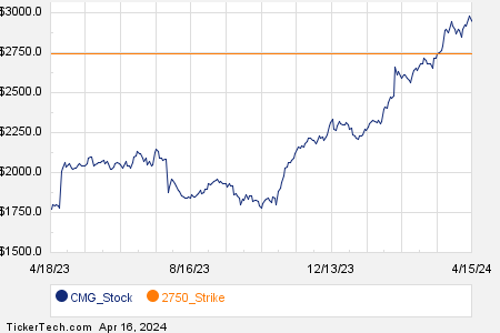 The $2750 strike put option expiring on June 21, 2024, has witnessed particularly heightened activity, with 425 contracts changing hands, representing around 42,500 underlying shares of CMG. For investors observing, a visual depiction of CMG’s trailing twelve-month trading history can be observed below, with the $2750 strike highlighted in vivid orange:
