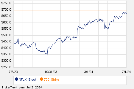 Notably, the $700 strike call option expiring on July 05, 2024, has seen an extraordinary volume of 3,080 contracts today, representing about 308,000 underlying shares of NFLX. This surge might indicate a strong bullish sentiment towards the stock. A visual representation of NFLX’s trading history shows the $700 strike highlighted in an attention-grabbing orange hue.