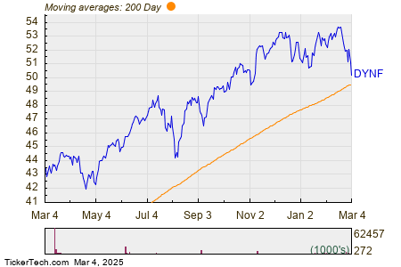 Looking at the chart above, DYNF’s low point in its 52 week range is $41.86 per share, with $53.83 as the 52 week high point — that compares with a last trade of $50.17. Comparing the most recent share price to the 200 day moving average can also be a useful technical analysis technique — learn more about the 200 day moving average ».