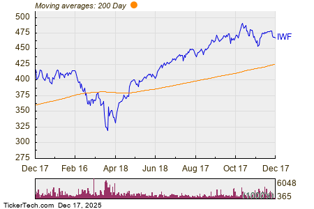 The chart below shows the one year price performance of IWF, versus its 200 day moving average:
