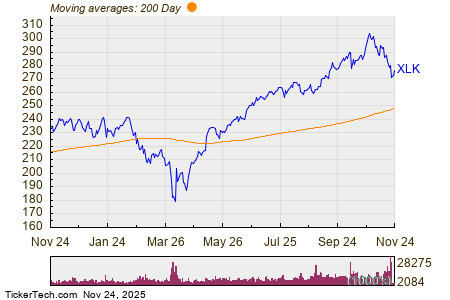 Looking at the chart above, XLK’s low point in its 52 week range is $172.45 per share, with $305.99 as the 52 week high point — that compares with a last trade of $276.74. Comparing the most recent share price to the 200 day moving average can also be a useful technical analysis technique — learn more about the 200 day moving average ».